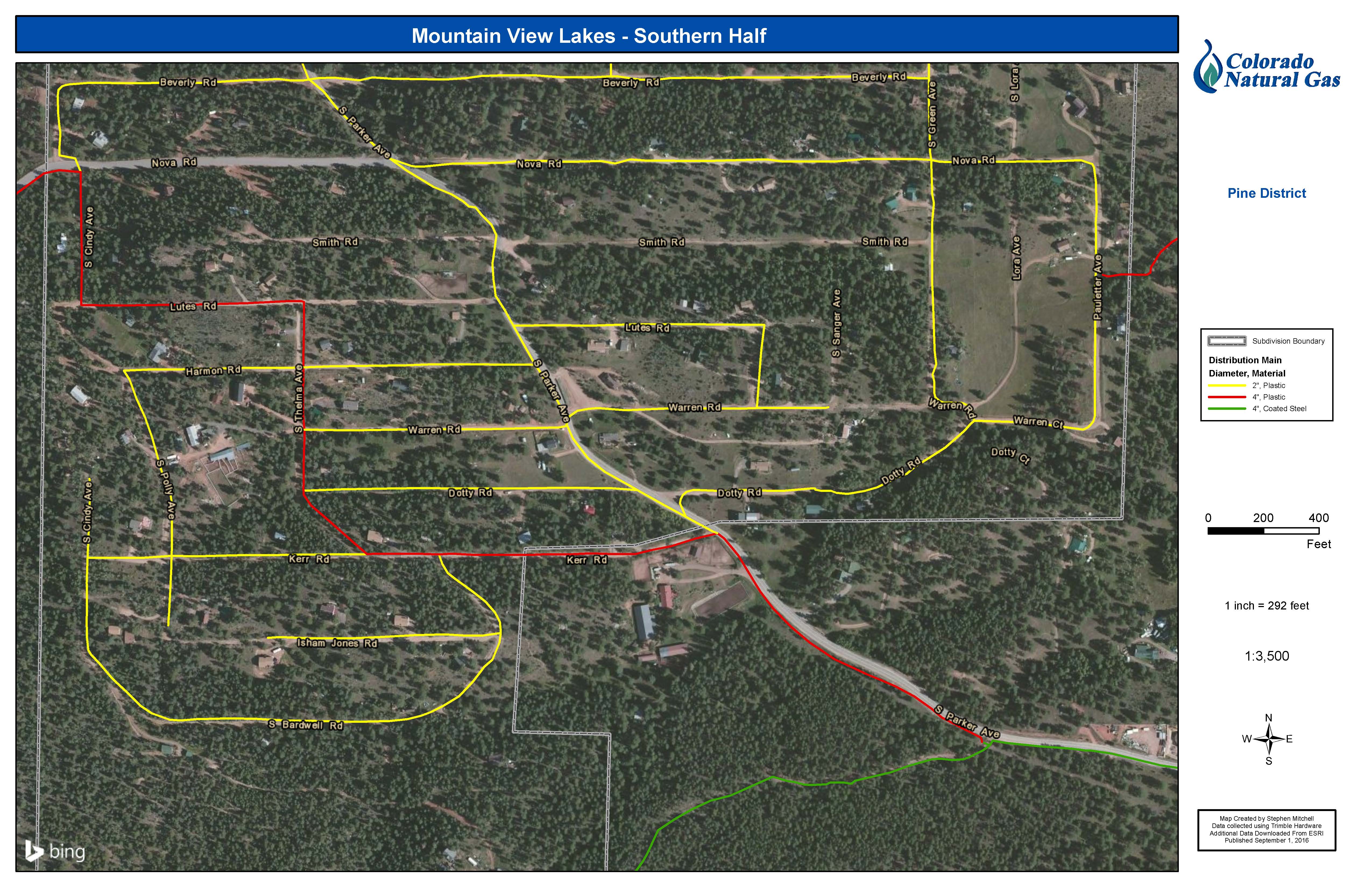Buried Natural Gas Line InformationYellow Lines: 2″ Plastic pipeRed Lines: 4″ Plastic pipeGreen Lines: 4″ Coated steel pipeNorthern Half(click to view full size image)Southern Half(click to view full size image)